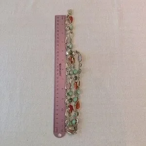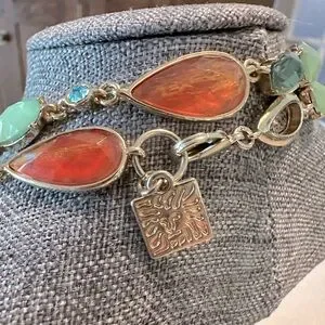 I love this necklace! Almost kept this one because it's harder to find this length of necklace to layer with. It is very pretty alone but worn layered would be fabulous. The stations feature a peachy, shimmery orange faceted cabochon, two different light green faceted ovals and turquoise blue crystals as well as some tear drop shapes. All are linked together for a lot of movement when wearing!