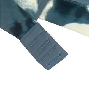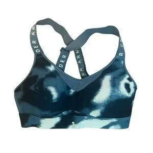 Under Armour supportive women's sports bra with teal yellow and blue patterning. 4 clasp options. Branding on cross back straps and front as shown. Inner padding.