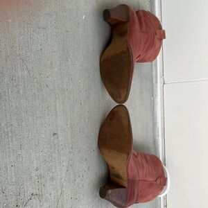 Vintage 1970s 1980s slightly upscale yet casual Gallenkamp boots with a chic, sleek, sexy silhouette. Stacked, sturdy block heel and a gentle almond toe. Shaped leather patch detail around the pointed toe. Dips in the front and back of the top of the boot. Western strap detailing on on the sides. These boots have seen a lot of life. Rust red, burgundy, muddy reddish orange discoloring throughout but it adds to the rustic, weathered look. Well worn soles and splotches in the coloring. Soft and comfortable suede lining on the inside of the boot. Chic, sexy, western, desert, cowboy, cowgirl vibes. Sole has crinkling on the inside of the boots. Super distressed but too cool and stylish not to feature (see photos). Mid shin height and easygoing pull on style. Label says size 8M.