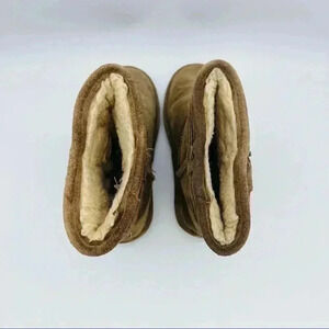 These brown/tan suede kids boots have a decorative strap with buckle around the top. They are just above the ankle.