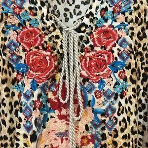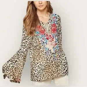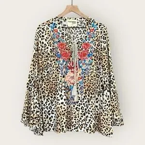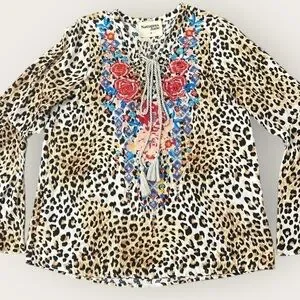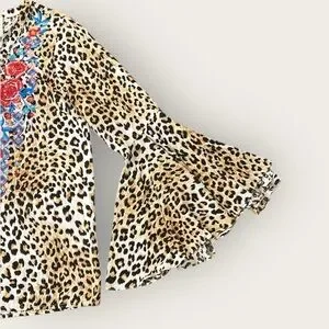 Savanna Jane Floral Embroidered Leopard Print Bell Sleeve Blouse Size Medium