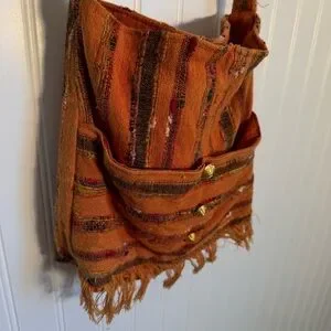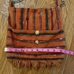 This is a unique, handmade boho-style shoulder bag with a vibrant orange and brown striped pattern. It has a woven texture, adding a rustic, artisanal feel. The front features three decorative gold buttons, and the bottom is adorned with playful fringe detailing. The chain strap adds a touch of contrast, blending vintage and modern styles. Perfect for a casual outing or as a statement accessory, this bag has both character and charm. Ideal for those who appreciate one-of-a-kind, artisan-made items.