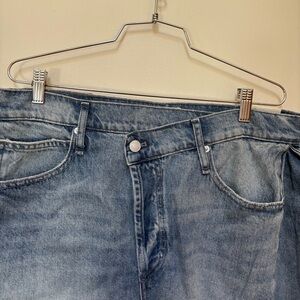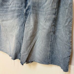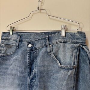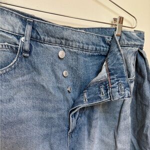 Features: Rigid denim fabrication, belt loops at waistband, button closure, 5-pocket styling, cutoff style with raw hems, overlapping waistband detail