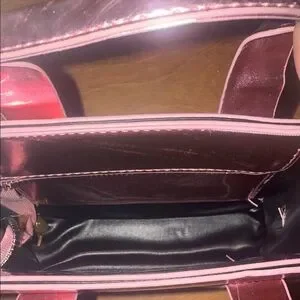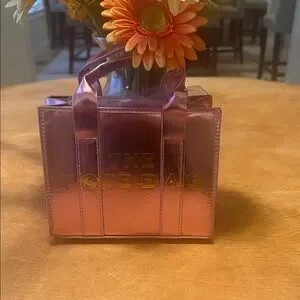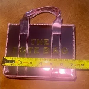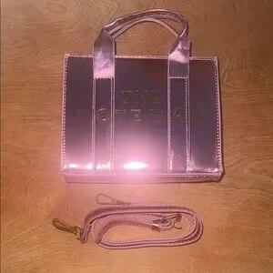 Stylish metallic pink mini tote bag with gold lettering. Perfect for a chic look. Can fit an iPhone 16 with room to spare. Comes with matching crossbody strap. Please look closely at pics & videos prior to purchase. Feel free to ask questions.