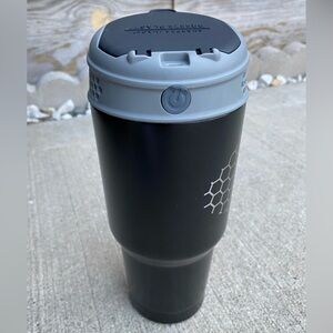 Sleek tumbler with a modern design. Black exterior with gray accents. Perfect for on-the-go use. Ice pack and charger not included.