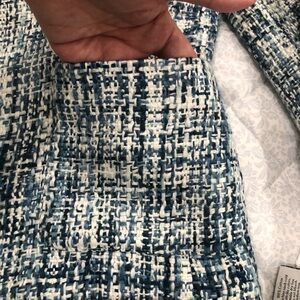 Elegant tweed blazer with fringe details. Features button closure and tailored fit.