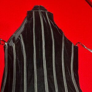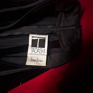Elevate your evening look with this stunning Tadashi Neiman Marcus gown. Designed with dramatic vertical velvet panels over sheer mesh contrast, this gown elongates the body while creating elegant movement with every step. The sleeveless silhouette and full-length flowing skirt make this a show-stopping choice for black-tie events, galas, or formal occasions.