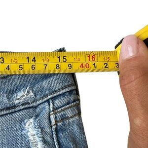Classic blue denim jeans. Features a silver button closure. Timeless style.