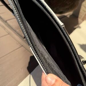 Stylish colorblock tote bag featuring black, white, red, and tan panels. Perfect for adding a pop of color to any outfit.
