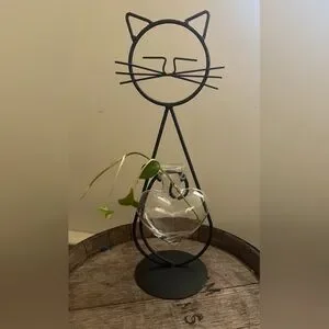 Adorable cat shaped metal holder with a clear glass vase. Ideal for small plants or flowers.