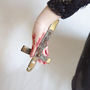 New, oddity doll by Cradle to Grave Curiosities. It is a hand crafted upcycled, scary, gothic horror, porcelain doll. Her name is “Lucy (Dracula’s bride)” from “Dracula”. This is from their “Dearly Departed Doll” series. Comes with a framed photo of what Lucy used to look like before she become one of the “undead”. Her eyes and wrists have been scratched. Lucy is holding an antique crucifix with teeth marks on her neck and blood on her hands and mouth.