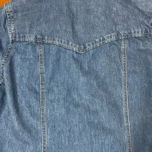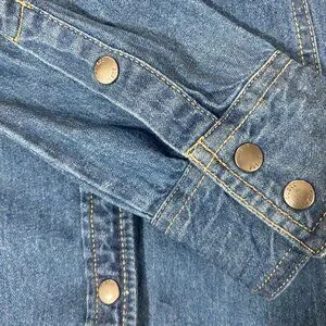Description: Fitted denim long-sleeve blouse with bronze-coloured button accents.