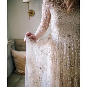 Flawed condition; tulle hem has stains and some damage, two areas where beading is missing, minor loose threads (which seems normal for this style), and I believe the sleeve cuffs were trimmed to 3/4 sleeves. Flaws are in the layout with 5 pictures - the other two layouts are showing the beadwork. If measurements are needed please let me know.