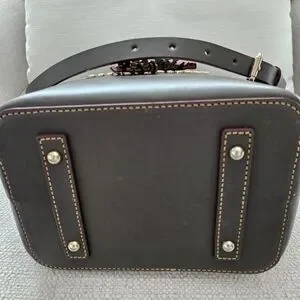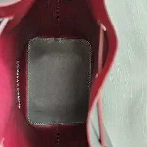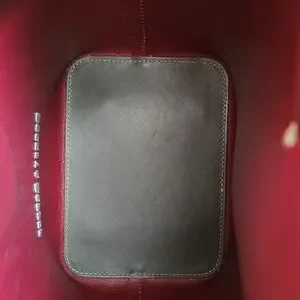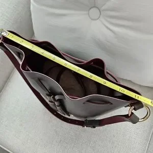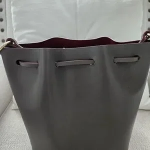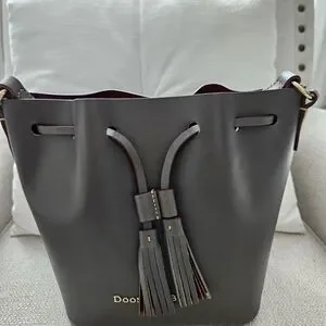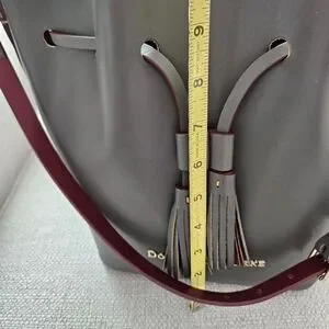 Stylish and versatile, this Dooney & Bourke bucket bag features a sleek grey exterior with elegant burgundy interior. Perfect for any occasion, it combines functionality with timeless design. Includes matching wallet. Small scratch on the back of bag. See pics. Both are in excellent pre-owned condition.