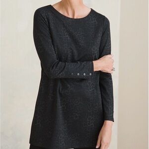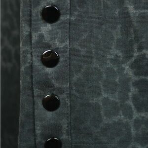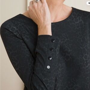 Chico's blouse with a subtle black and gray animal print pattern. Long sleeves with button detail. Ideal for versatile styling.