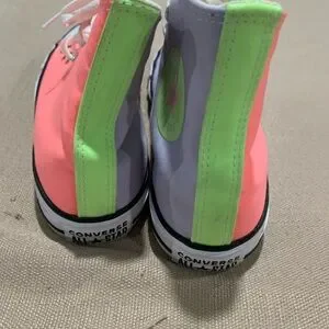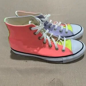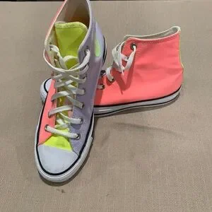 Stand out with these vibrant Converse high-tops. Neon pink and yellow design. Perfect for bold style.