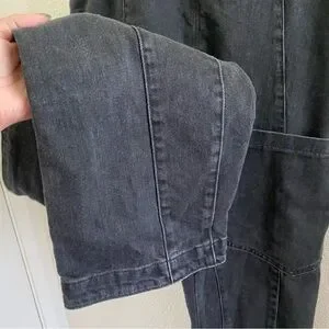 Features: Denim fabrication, rigid feel, low scoop neckline, seam detail throughout, oversized patch pockets, drop-crotch harem-style legs, low back with adjustable shoulder straps