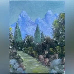 Enhance your home with this captivating mountain pathway canvas art. Featuring rich shades of blue and green, it brings a touch of nature indoors. Original oil painting on stretched canvas. Landscape painting, secret garden with mountains in the background, 8 x 10 x .5 inches. Item is not framed,