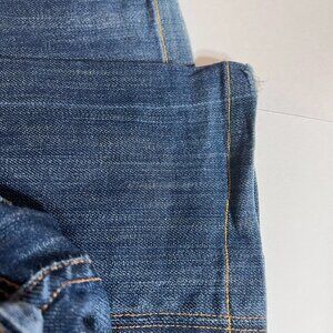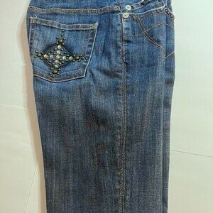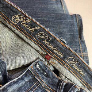 Pre Owned beautiful Premium Plush Denim brand of women’s pants with rhinestones on the right back pocket and a stitching design on lower left back pocket is in excellent condition. This boot cut pant is a dark denim with 5 pockets and 1 button with zipper fly.