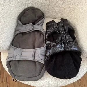 2 set of dog puffer jacket in like new condition, the grey is a size M and the black a size L but runs small, Keep your dog warm and stylish with these gray and black puffer jackets. Perfect for chilly days.