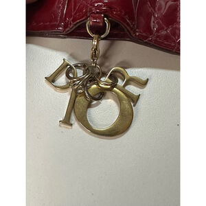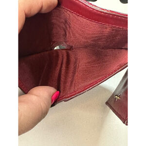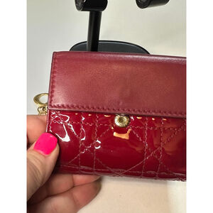 Pre-owned Christian Dior red patent leather wallet. Dimensions approximately 3" x 4". Features a quilted pattern, gold-tone Dior charm, and snap closure. Interior shows minor wear; one small mark visible. Exterior shows some minor signs of use. Material is primarily patent leather with a fabric lining. Functionality is intact. Overall condition is good, reflecting previous use.