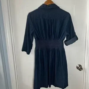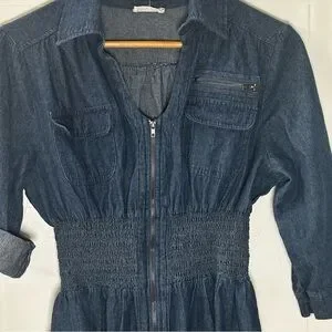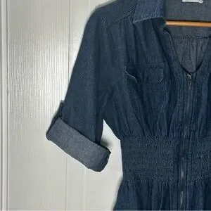 Denim Zip‑Front Utility Dress Small Smocked Waist Roll‑Tab Sleeves