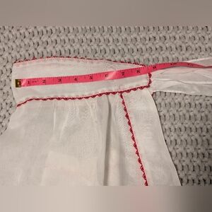 Vintage Elegant white sheer apron featuring red trim and a small pocket. No tags or brand.