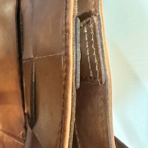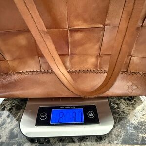 PATRICIA NASH VINTAGE STYLE WOVEN LEATHER TOTE. 12” (H) × 13” (W) × 5” (D)