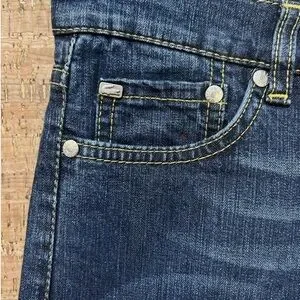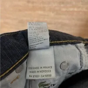 These Lacoste blue boot cut jeans feature a classic indigo color with contrasting gold stitching that highlights the seams and waistband. The thick waistband adds to the overall comfort and style, making them a versatile choice for any casual occasion.