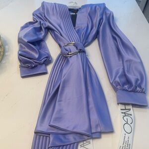 Chic lavender mini dress by Zhivago. Features a belted waist and voluminous sleeves. Ideal for stylish outings.
