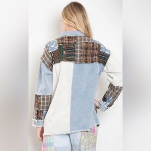 Stylish patchwork denim jacket featuring a blend of blue, white, and brown tones. Perfect for adding a unique touch to your wardrobe.