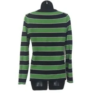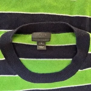 GO IRISH! A classic J. Crew cashmere style with vibrant kelly green and navy blue stripes for a fresh restart for fall. The material is so soft and the crew neck and rolled details at the hem and on the sleeves are so unique at fun.