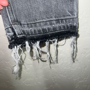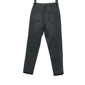 These are a pair of Topshop Moto distressed denim jeans in a dark gray wash. They are a size W25 L28 and have a high rise. The jeans have a straight leg fit and feature a frayed hem. There are several small holes and tears throughout the jeans, including on the front pockets, back pockets, and legs. The jeans are made of 100% cotton and are in good condition with some signs of wear. The jeans have a button fly closure and five pockets. The jeans are approximately 26 inches inseam and 12 inches wide at the waist.