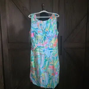 nwt lilly pulitzer courtney shift bright and bold abstract print sea salt and sand. Features a mix of blue, pink, and green. Sleeveless design for a chic look. size 4.
