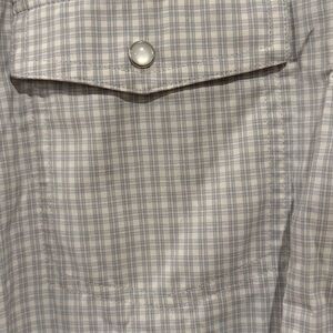 Poncho men’s western style shirt in a classic gray and white plaid pattern. Features pearl snap button front closure, dual chest flap pockets with snap buttons, and long sleeves with snap cuffs. Lightweight and comfortable — in EUC! Men’s size XXL