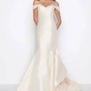 Ivory off the shoulder mermaid shape wedding or evening dress with flower tulle train