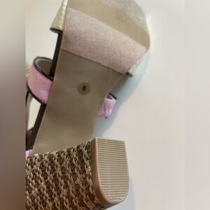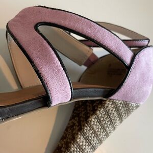 Plume by Faryl Robin block heel sandals in size 8 featuring a modern colorblock design with lavender suede straps, white textured toe detail, and black piping.