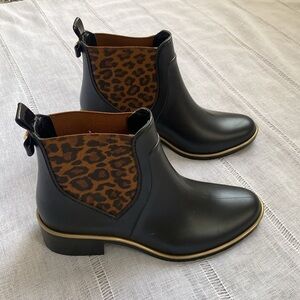 Kate Spade Sedgewick Domina Leopard Print Chelsea Ankle Boots. Size 4/5. EU 35. Water resistant rubber with elastic and rubber 1.2" heel. Pull on with cute gold tone embellishment. Look brand new! Probably only worn once. Gold tone detailing and leopard print. Almond shape toe. Stylish and great for wet days.