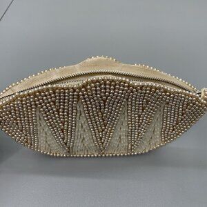 Vintage Beaded Clutch Evening Purse Makeup Bag Zip Top Faux String Pearls Small