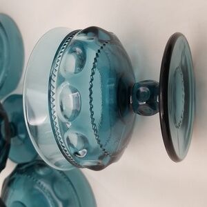 Lot of 6 vintage 1970's Indiana Colony Kings Crown pattern blue glass pedestal sherbet dessert glasses. 3 ⅞" in diameter and 3 ⅛" tall. No chips or cracks.