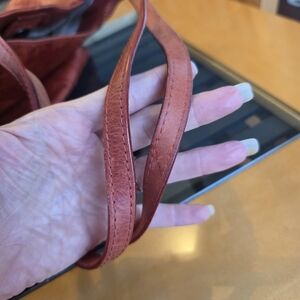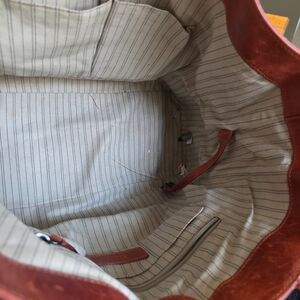 Stylish Frye shoulder bag in rich tan leather. Perfect for everyday use. Durable and chic design. 12 1/2" tall, 19" wide. Red leather. Zero scratches. Just the original worn leather look. Beautiful bag for all seasons.