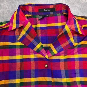 This Ishyu blouse in size 14 sports a vibrant Madras plaid in red, pink, blue, yellow, black, and purple. Designed in Hong Kong, it features gold buttons, making it perfect for parties. Its silk material ensures comfortable wear.