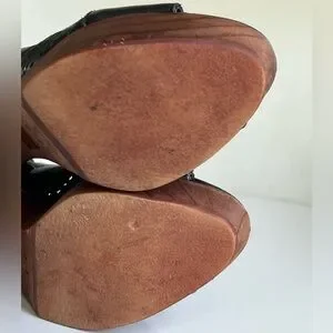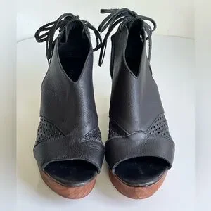 Chic black leather mules. Features wooden brown block heels. Open toe and lace-up back.