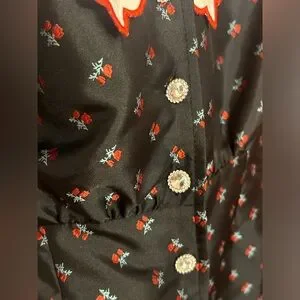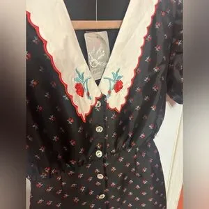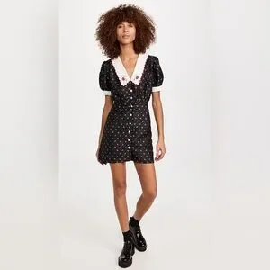 A scalloped contrast collar adds to the charming look of this prettily patterned Sister Jane black mini dress. To round out your outfit, opt for the tonal shoes of your choice