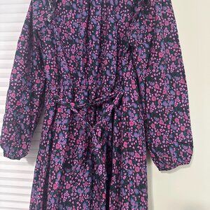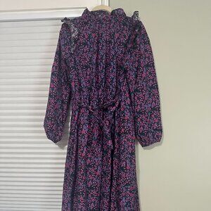 Perfect transitional piece for fall, this is a beautiful floral print maxi dress that would look great paired with a black leather jacket or a cotton sweater. Xirena purple and black floral print with a ruffle detail on the shoulders. 100% cotton.