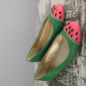 Kate Spade flats, watermelon shoes, jewel embellished ballet flats, summer statement shoes, green pink flats, Kate Spade size 7.5, whimsical designer flats, colorful preppy shoes, fruity fashion accessories, playful summer flats