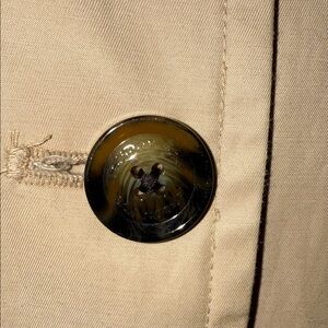 Stylish khaki trench coat by London Fog. Features a classic design with a belt and button details. Removable hood. Ideal for versatile wear.