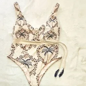 NWT Cosita Linda Elegant Palm Print One-Piece Swimsuit:Tan/brown/navy: Size- Med