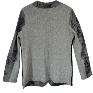 This unique blazer is mixed media, with a comfortable stretch knit. The size tag is missing. Please see the actual measurements to ensure a proper fit.