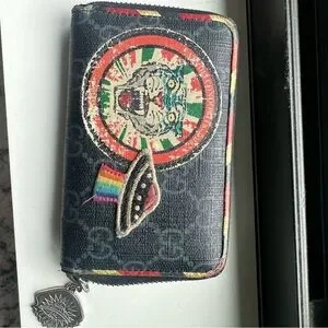 Chic Gucci wallet in black. Features vibrant planet embroidery and zip-around closure.